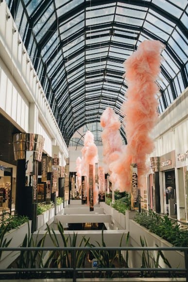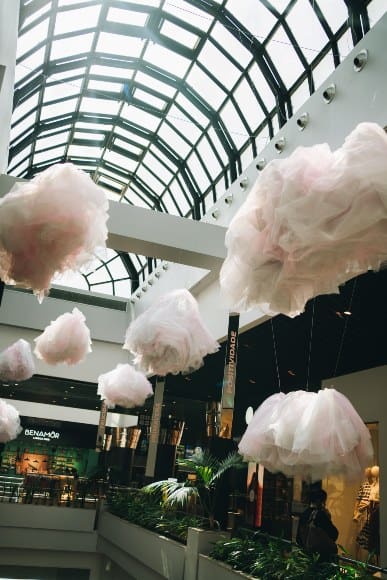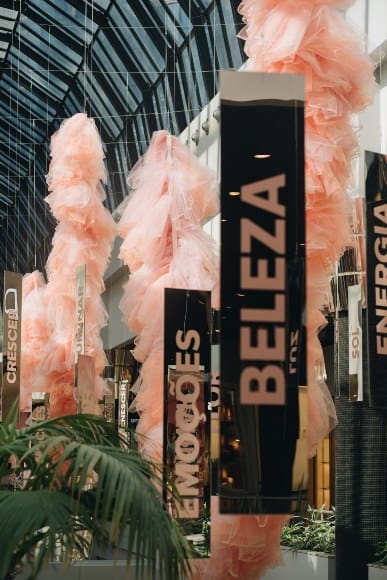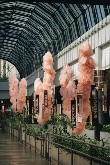 A instalação transforma diferentes espaços do shopping, criando um ambiente envolvente e inspirador. Elementos suspensos interagem com a luz e o movimento, despertando a sensação de renovação e leveza que caracteriza esta época do ano.